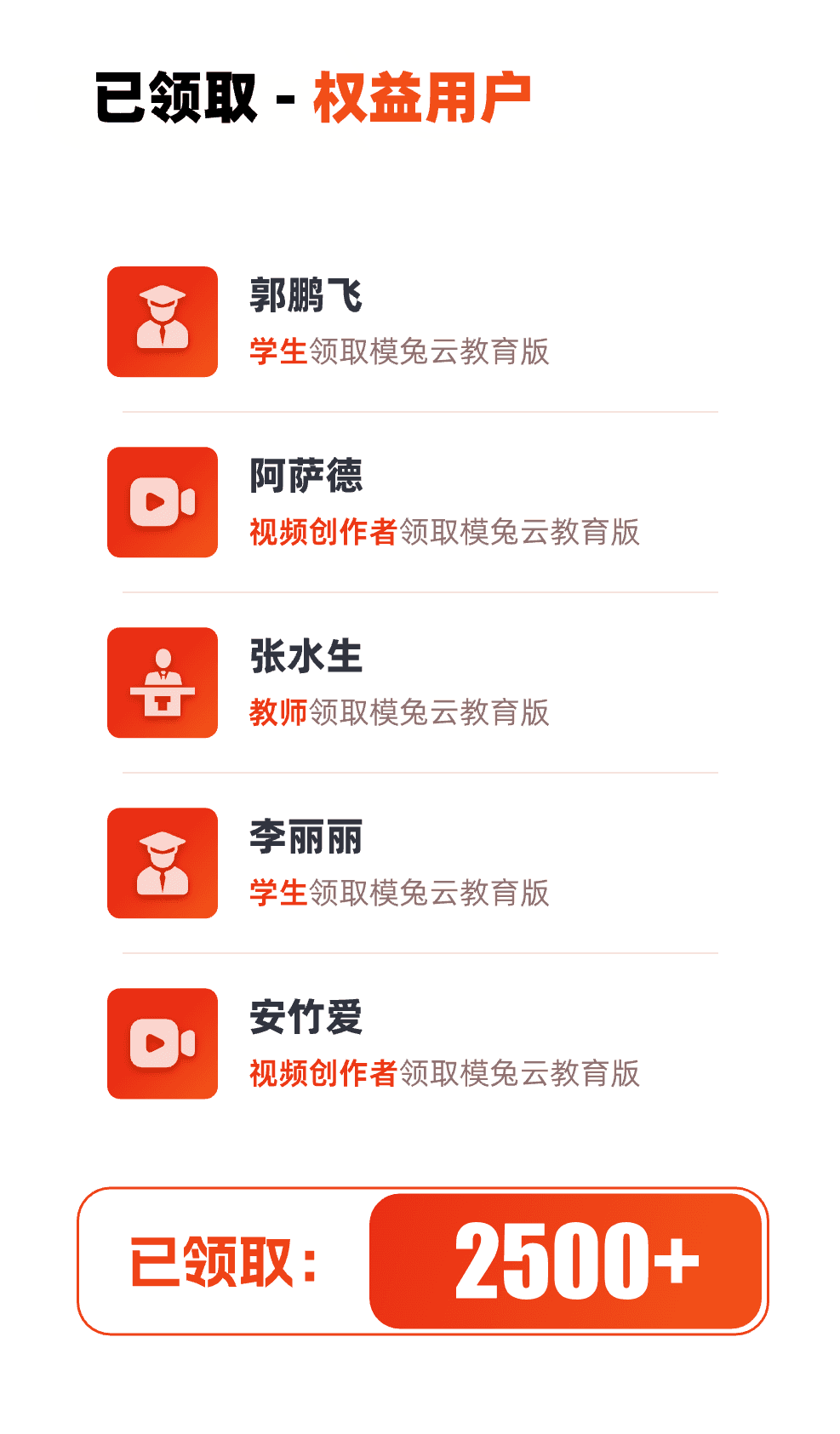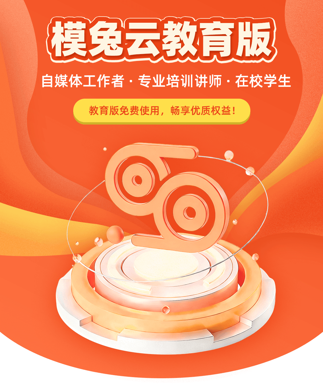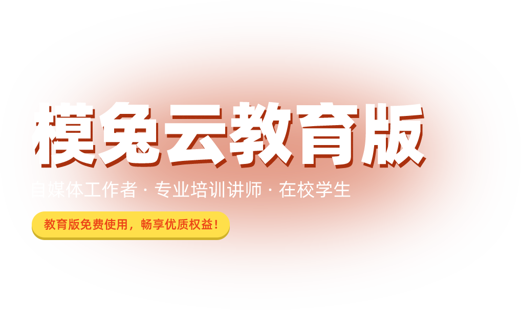 本软件教育版适用对象与模兔云普通VIP保持一致,面向教育及内容创作领域相关群体,具体涵盖抖音、B站、小红书等平台UP主,专业培训讲师,在校教师及在校学生。该版本为免费使用版本,有效期为一年。用户在有效期届满后,可于到期前30天内重新提交申请,申请权限可持续至用户完成学业(仅限学生群体)。