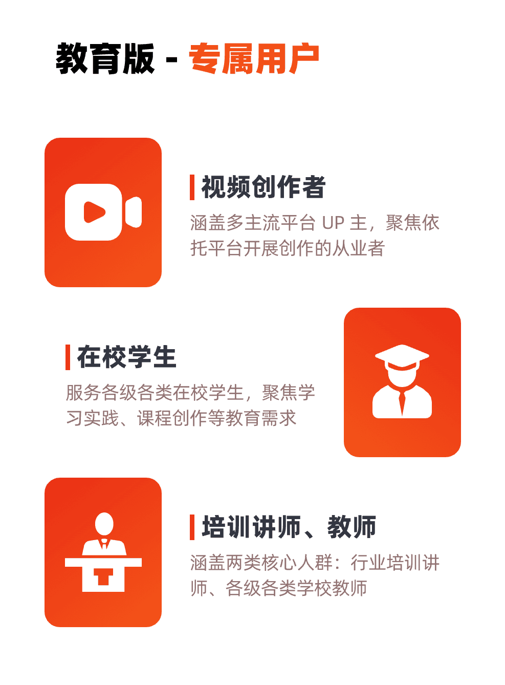 覆盖各级各类学校在校学生,核心服务于学生的学习实践、课程创作等教育相关需求。